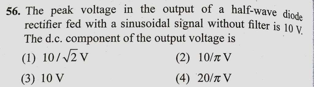 The peak voltage in the output of a half-wave diode rectifier fed with a sinusoidal signal without filter is 10 V. The d.c. component of the output voltage is The peak voltage in the output of a half-wave diode rectifier fed with a sinusoidal signal without filter is 10 V. The d.c. component of the output voltage is October 22, 2020 Category: Uncategorised (JEE Advanced Physics by BM Sharma + GMP Solutions) , Facebook Messenger WhatsApp Share this:TwitterFacebook Related
