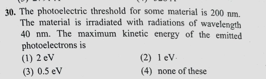 The photoelectric threshold for some material is 200 nm. The material is irradiated with radiations of wavelength 40 nm. The maximum kinetic energy of the emitted photoelectrons is The photoelectric threshold for some material is 200 nm. The material is irradiated with radiations of wavelength 40 nm. The maximum kinetic energy of the emitted photoelectrons is October 14, 2020 Category: Uncategorised (JEE Advanced Physics by BM Sharma + GMP Solutions) , Facebook Messenger WhatsApp Share this:TwitterFacebook Related
