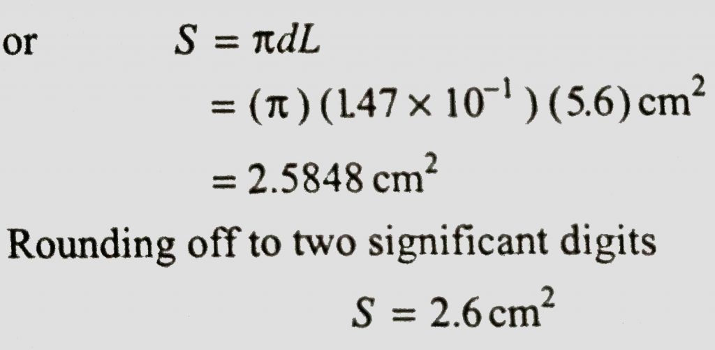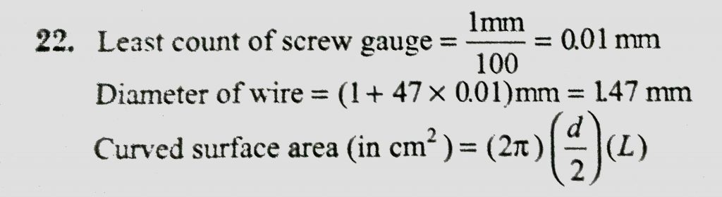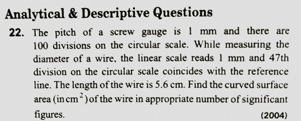 The pitch of a screw gauge is 1 mm and there are 100 divisions on the circular scale. While measuring the diameter of a wire, the linear scale reads 1 mm and 47th division on the circular scale coincides with the reference line. The length of the wire is 5.6 cm. Find the curved surface area (in cm ^2) of the wire in appropriate number of significant figures.