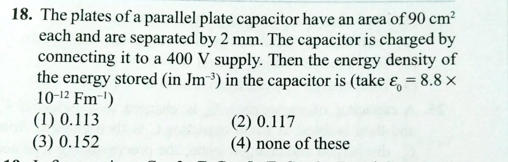 The plates of a parallel plate capacitor have an area of 90 cm 2 each and are separated by 2.5 mm. The capacitor is charged by connecting it to a 400 V supply. Then the energy stored ( in j/mn) in teh capacitor is The work done in increasing the potential of a capacitor from V volt to 2V volt is W. Then the work done in increasing the potential of the same capacitor from 2V volt to 4V volt will be? November 7, 2020 Category: Uncategorised (JEE Advanced Physics by BM Sharma + GMP Solutions) , Facebook Messenger WhatsApp Share this:TwitterFacebook Related