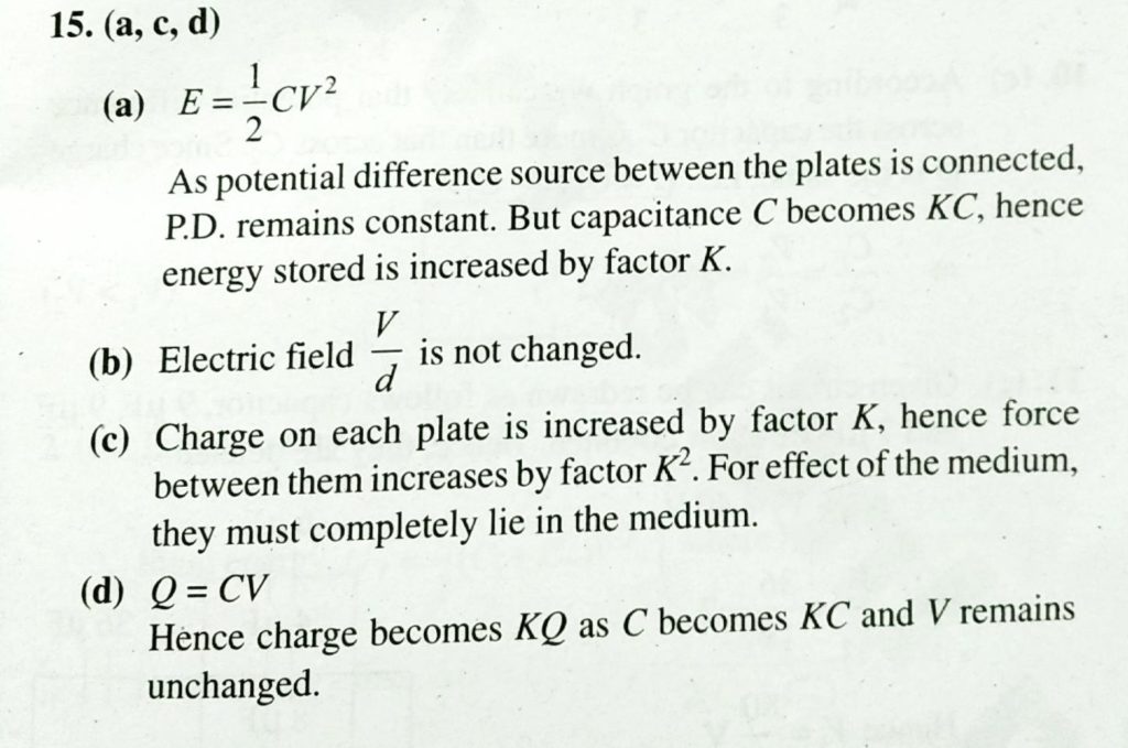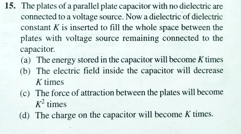 The plates of a parallel plate capacitor with no dielectric are connected to a voltage source. Now a dielectric of dielectric constant K is inserted to fill the whose space between the plates with voltage source remaining connected to the capacitor- Potential difference between centre and the surface of sphere of radius R having uniform volume charge density p with in it will be September 18, 2020 Category: Uncategorised (JEE Advanced Physics by BM Sharma + GMP Solutions) , Facebook Messenger WhatsApp Share this:TwitterFacebook Related