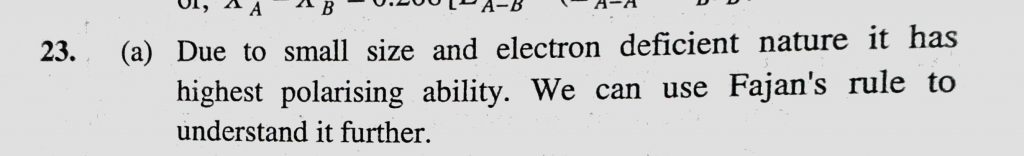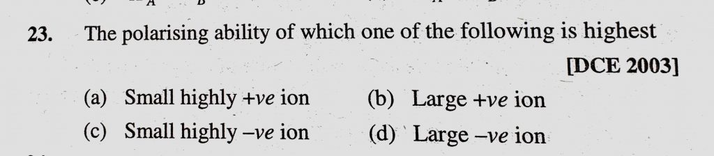 The polarising ability of which one of the following is highest (a) Small highly +ve ion (b) Large +ve ion (c) Small highly -ve ion (d) Large -ve ion The polarising ability of which one of the following is highest (a) Small highly +ve ion (b) Large +ve ion (c) Small highly -ve ion (d) Large -ve ion November 10, 2020 Category: Uncategorised (JEE Advanced Physics by BM Sharma + GMP Solutions) , Facebook Messenger WhatsApp Share this:TwitterFacebook Related