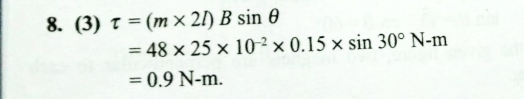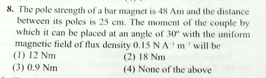 The pole strength of a bar magnet is 48 ampere-metre and the distance between its poles is 25cm. The moment of the couple by which it can be placed at an angle of 30∘ with the uniform magnetic intensity of flux density 0.15 newton/ampere-metre will be