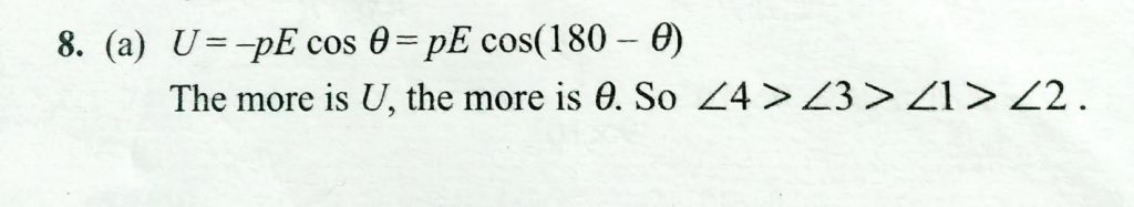 The potential energies associated with four orientations of an electric dipole in an electric field are (1)−5U0,(2)−7U0,(3)3U0,and(4)5U0, where U0 is positive. Rank the orientationa according to the a. angle between the electric dipole moment P→ and the electric field `vec E, and B magnitude of the torque on the electric dipole, greatest first.