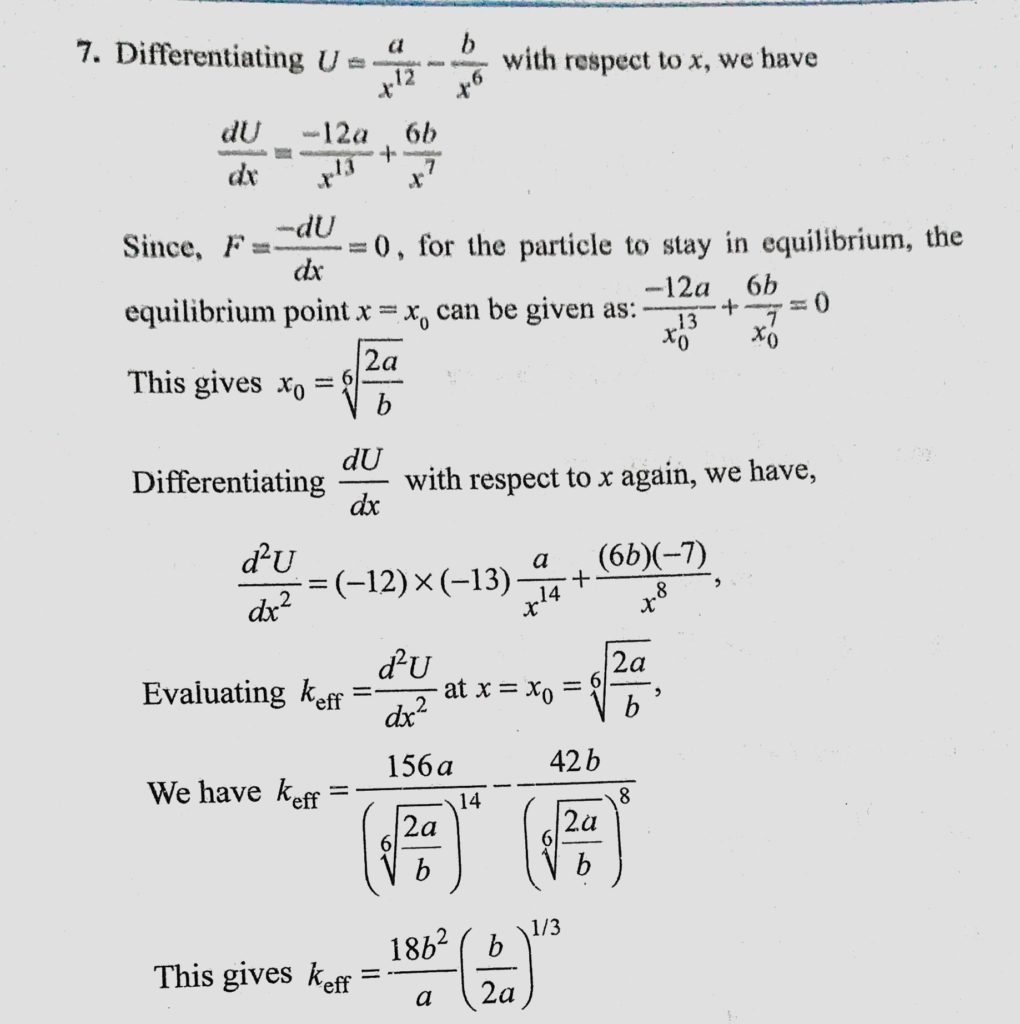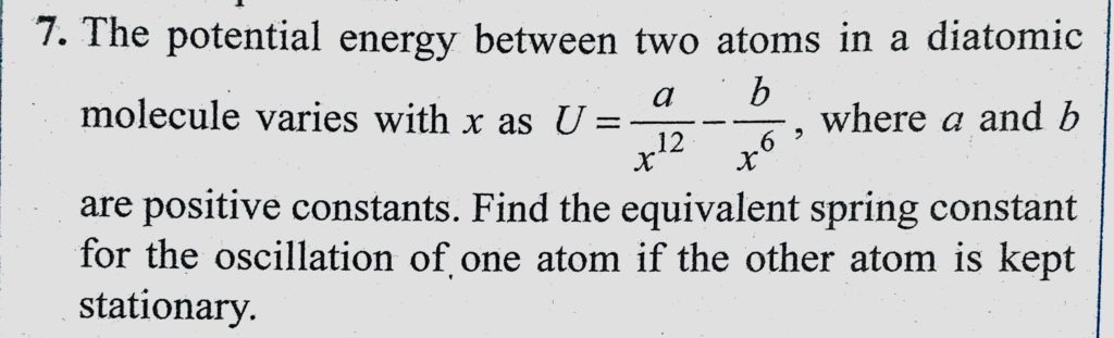 The potential energy between two atoms in a diatomic molecule varies with x as U = a / x^12 – b/x^6, where a and b are positive constants. Find the equivalent spring constant The potential energy between two atoms in a diatomic molecule varies with x as U = a / x^12 - b/x^6 where a and b are positive constants. Find the equivalent spring constant October 30, 2020 Category: Uncategorised (JEE Advanced Physics by BM Sharma + GMP Solutions) , Facebook Messenger WhatsApp Share this:TwitterFacebook Related