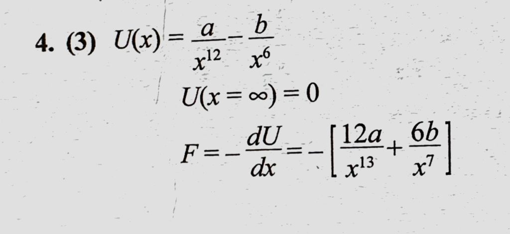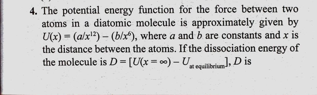 The potential energy function for the force between two atoms in a diatomic molecule is approximately given by U(x) = (a/x^12) – (b/x^6), where a and b are constants and x is the distance The potential energy function for the force between two atoms in a diatomic molecule is approximately given by U(x) = (a/x^12) - (b/x^6) where a and b are constants and x is the distance October 14, 2020 Category: Uncategorised (JEE Advanced Physics by BM Sharma + GMP Solutions) , Facebook Messenger WhatsApp Share this:TwitterFacebook Related