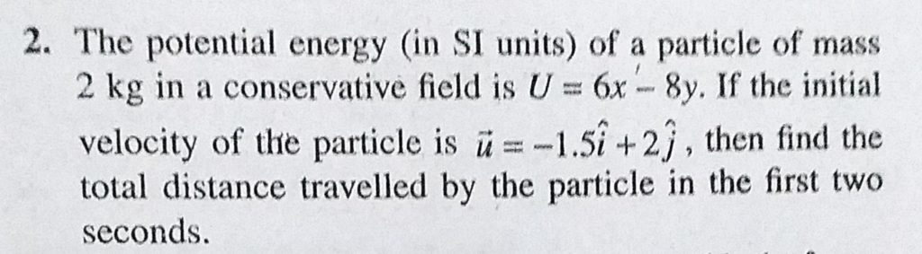 The potential energy ( in SI units ) of a particle of mass 2 kg in a conservative field is U = 6x – 8y. If the initial velocity of the particle is u = -1.5i + 2j, then find the total distance travelled The potential energy ( in SI units ) of a particle of mass 2 kg in a conservative field is U = 6x - 8y. If the initial velocity of the particle is u = -1.5i + 2j then find the total distance travelled October 3, 2020 Category: Uncategorised (JEE Advanced Physics by BM Sharma + GMP Solutions) , Facebook Messenger WhatsApp Share this:TwitterFacebook Related