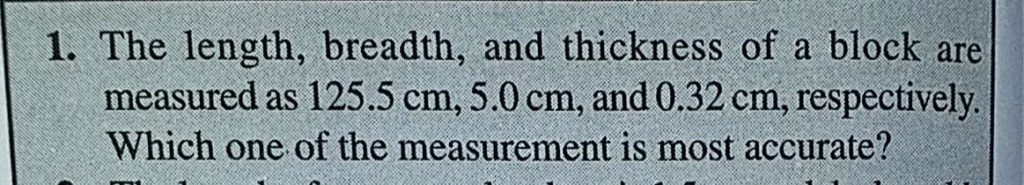 The length, breadth, and thickness of a block are measured as 125.5 cm, 5.0 cm, and 0.32 cm, respectively. Which one of the measurement is most accurate? 5.0 cm and 0.32 cm and thickness of a block are measured as 125.5 cm breadth respectively. Which one of the measurement is most accurate? The length September 14, 2020 Category: Uncategorised (JEE Advanced Physics by BM Sharma + GMP Solutions) , Facebook Messenger WhatsApp Share this:TwitterFacebook Related