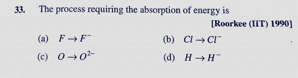 The process requiring the absorption of energy is (a) F to F- (b) Cl to Cl- (c) O to O 2- (d) H to H- The process requiring the absorption of energy is (a) F to F- (b) Cl to Cl- (c) O to O 2- (d) H to H- November 10, 2020 Category: Uncategorised (JEE Advanced Physics by BM Sharma + GMP Solutions) , Facebook Messenger WhatsApp Share this:TwitterFacebook Related