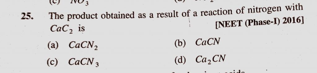 The product obtained as a result of a reaction of nitrogen with CaC2 is (a) CaCN2 (b) CaCN (c) CaCN3 (d) Ca2Cn The product obtained as a result of a reaction of nitrogen with CaC2 is (a) CaCN2 (b) CaCN (c) CaCN3 (d) Ca2Cn November 18, 2020 Category: Uncategorised (JEE Advanced Physics by BM Sharma + GMP Solutions) , Facebook Messenger WhatsApp Share this:TwitterFacebook Related