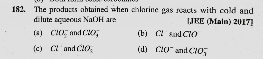 The products obtained when chlorine gas reacts with cold and dilute aqueous NaOH are (a) ClO2 – and ClO3 – (b) Cl- and ClO – The products obtained when chlorine gas reacts with cold and dilute aqueous NaOH are (a) ClO2 - and ClO3 - (b) Cl- and ClO - November 28, 2020 Category: Uncategorised (JEE Advanced Physics by BM Sharma + GMP Solutions) , Facebook Messenger WhatsApp Share this:TwitterFacebook Related