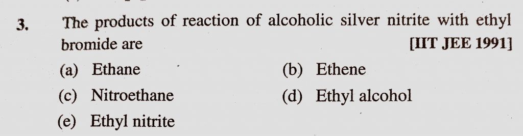 The products of reaction of alcoholic silver nitrate with ethyl bromide are (a) Ethane (b) Ethene (c) Nitroethane (d) Ethyl alcohol (e) Ethyl nitrite The products of reaction of alcoholic silver nitrate with ethyl bromide are (a) Ethane (b) Ethene (c) Nitroethane (d) Ethyl alcohol (e) Ethyl nitrite February 9, 2021 Category: Uncategorised (JEE Advanced Physics by BM Sharma + GMP Solutions) , Facebook Messenger WhatsApp Share this:TwitterFacebook Related