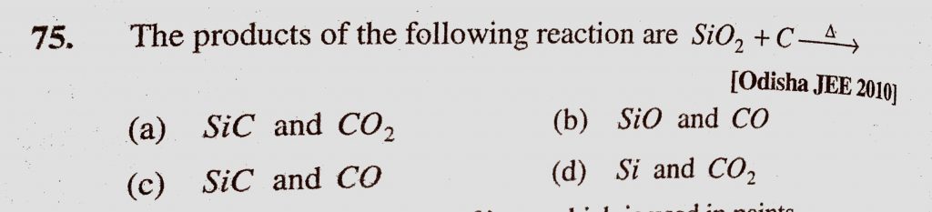 The products of the following reaction are SiO2 + C to (a) SiC and CO2 (b) SiO and CO (c) SiC and CO (d) Si and CO2 The products of the following reaction are SiO2 + C to (a) SiC and CO2 (b) SiO and CO (c) SiC and CO (d) Si and CO2 November 17, 2020 Category: Uncategorised (JEE Advanced Physics by BM Sharma + GMP Solutions) , Facebook Messenger WhatsApp Share this:TwitterFacebook Related