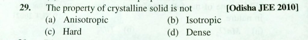 The property of crystalline solid is not (a) Anisotropic (b) Isotropic (c) Hard (d) Dense The property of crystalline solid is not (a) Anisotropic (b) Isotropic (c) Hard (d) Dense February 8, 2021 Category: Uncategorised (JEE Advanced Physics by BM Sharma + GMP Solutions) , Facebook Messenger WhatsApp Share this:TwitterFacebook Related