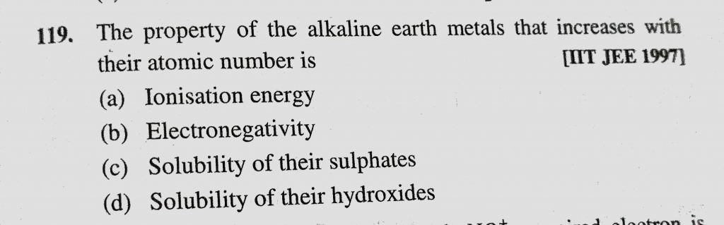 The property of the alkaline earth metals that increases with their atomic number is (a) Ionisation energy (b) Electronegativity The property of the alkaline earth metals that increases with their atomic number is (a) Ionisation energy (b) Electronegativity November 27, 2020 Category: Uncategorised (JEE Advanced Physics by BM Sharma + GMP Solutions) , Facebook Messenger WhatsApp Share this:TwitterFacebook Related