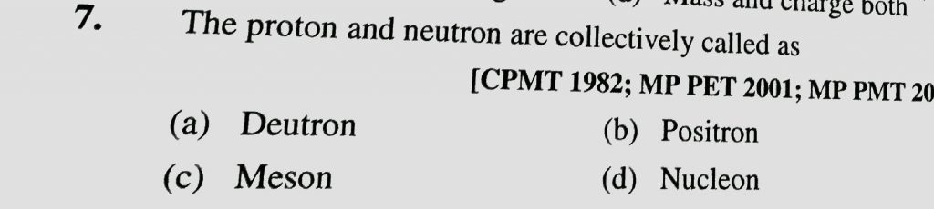 The proton and neutron are collectively called as (a) Deutron (b) positron (c) meson (d) Nucleon The proton and neutron are collectively called as (a) Deutron (b) positron (c) meson (d) Nucleon November 26, 2020 Category: Uncategorised (JEE Advanced Physics by BM Sharma + GMP Solutions) , Facebook Messenger WhatsApp Share this:TwitterFacebook Related