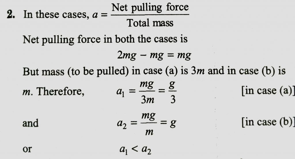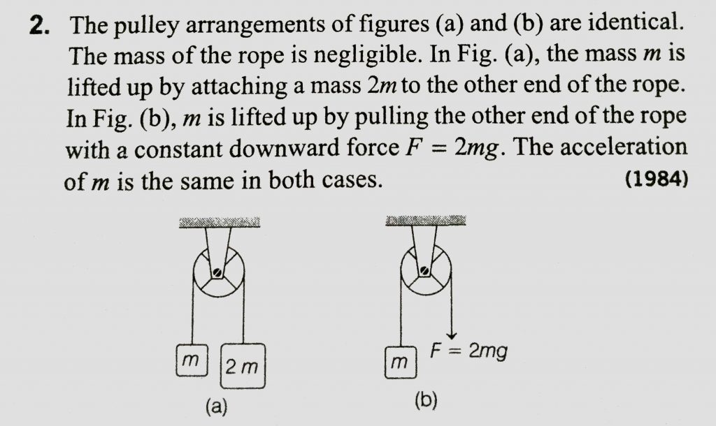 The pulley arrangements of figures (a) and (b) are identical. The mass of the rope is negligible. In Fig. (a), the mass m is lifted up by attaching a mass 2m to the other end of the rope. In Fig. (b), m is lifted up by pulling the other end of the rope with a constant downward force F=2mg. The acceleration of m is the same in both cases.