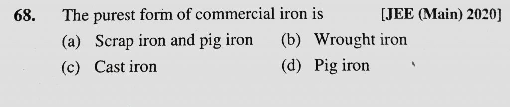 The purest form of commercial iron is (a) Scrap iron and pig iron (b) Wrought iron (c) Cast iron (d) Pig iron The purest form of commercial iron is (a) Scrap iron and pig iron (b) Wrought iron (c) Cast iron (d) Pig iron December 3, 2020 Category: Uncategorised (JEE Advanced Physics by BM Sharma + GMP Solutions) , Facebook Messenger WhatsApp Share this:TwitterFacebook Related