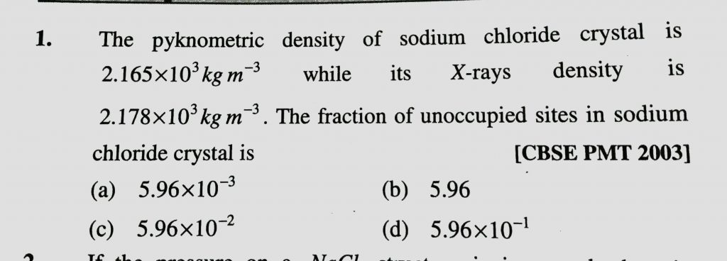 The pyknometric density of sodium chloride crystal is 2.165 x 10^3 kg/m^3 while its X – rays density is 2.178 x 10^3 kg/m^3. The fraction of unoccupied sites in sodium chloride crystal is The pyknometric density of sodium chloride crystal is 2.165 x 10^3 kg/m^3 while its X - rays density is 2.178 x 10^3 kg/m^3. The fraction of unoccupied sites in sodium chloride crystal is December 17, 2020 Category: Uncategorised (JEE Advanced Physics by BM Sharma + GMP Solutions) , Facebook Messenger WhatsApp Share this:TwitterFacebook Related