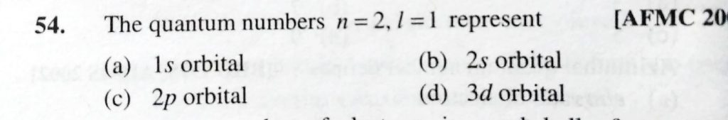 The quantum numbers n =n 2, l = 1 represent (a) 1s orbital (b) 2s orbital (c) 2p orbital (d) 3d orbital l = 1 represent (a) 1s orbital (b) 2s orbital (c) 2p orbital (d) 3d orbital The quantum numbers n =n 2 November 28, 2020 Category: Uncategorised (JEE Advanced Physics by BM Sharma + GMP Solutions) , Facebook Messenger WhatsApp Share this:TwitterFacebook Related