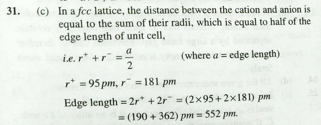 The radii of Na^+ and Cl ^- ions are 95 pm and 181 pm respectively. THe edge of NaCl unit cell is (a) 276 pm (b) 138 pm (c) 552 pm (d) 415 pm The radii of Na^+ and Cl ^- ions are 95 pm and 181 pm respectively. THe edge of NaCl unit cell is (a) 276 pm (b) 138 pm (c) 552 pm (d) 415 pm February 9, 2021 Category: Uncategorised (JEE Advanced Physics by BM Sharma + GMP Solutions) , Facebook Messenger WhatsApp Share this:TwitterFacebook Related