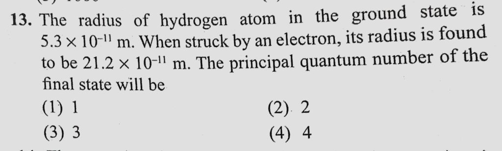 The radius of hydrogen atom in the ground state is 5.3 * 10^-11 m. When struck by an electron, its radius is found to be 21.2 * 10^-11 m. The principal quantum number of the its radius is found to be 21.2 * 10^-11 m. The principal quantum number of the The radius of hydrogen atom in the ground state is 5.3 * 10^-11 m. When struck by an electron October 15, 2020 Category: Uncategorised (JEE Advanced Physics by BM Sharma + GMP Solutions) , Facebook Messenger WhatsApp Share this:TwitterFacebook Related