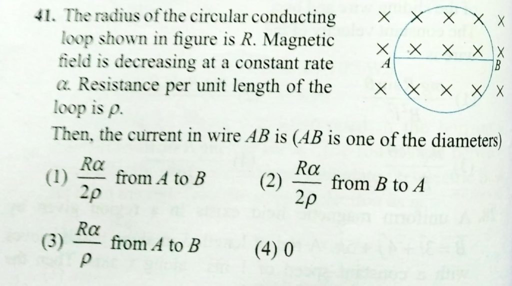 The radius of the circular conducting loop shown in figure is R. Magnetic field is decreasing at a constant rate alpha. Resistance per unit length of the loop is rho. Then, the current in wire AB is ( ab is one of the diameters ) the current in wire AB is ( ab is one of the diameters ) The radius of the circular conducting loop shown in figure is R. Magnetic field is decreasing at a constant rate alpha. Resistance per unit length of the loop is rho. Then October 20, 2020 Category: Uncategorised (JEE Advanced Physics by BM Sharma + GMP Solutions) , Facebook Messenger WhatsApp Share this:TwitterFacebook Related