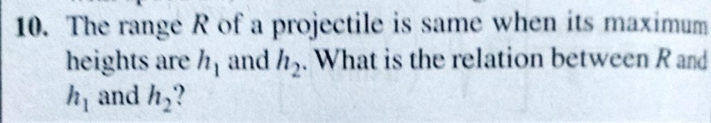 The range R of a projectile is same when its maximum heights are h1 and h2. What is the relation between R and h1 and h2? The range R of a projectile is same when its maximum heights are h1 and h2. What is the relation between R and h1 and h2? September 21, 2020 Category: Uncategorised (JEE Advanced Physics by BM Sharma + GMP Solutions) , Facebook Messenger WhatsApp Share this:TwitterFacebook Related