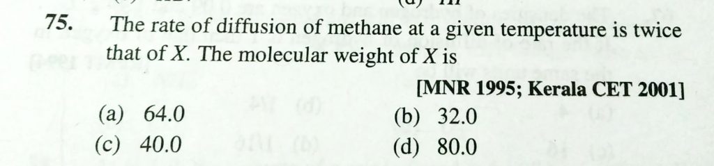 The rate of diffusion of methane at a given temperature is twice that of X. The molecular weight of X is (a) 64.0 (b) 32.0 (c) 40.0 (d) 80.0 The rate of diffusion of methane at a given temperature is twice that of X. The molecular weight of X is (a) 64.0 (b) 32.0 (c) 40.0 (d) 80.0 February 11, 2021 Category: Uncategorised (JEE Advanced Physics by BM Sharma + GMP Solutions) , Facebook Messenger WhatsApp Share this:TwitterFacebook Related