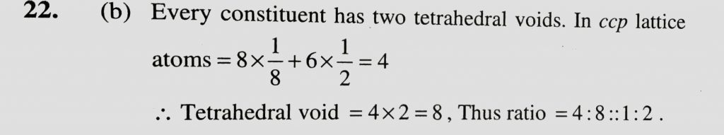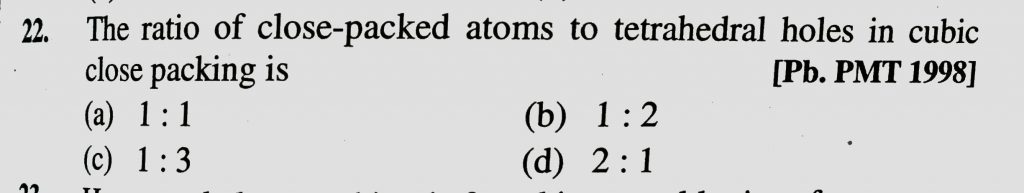 The ratio of close – packed atoms to tetrahedral holes in cubic close packing is (a) 1 : 1 (b) 1 : 2 (c) 1 : 3 (d) 2 : 1 The ratio of close - packed atoms to tetrahedral holes in cubic close packing is (a) 1 : 1 (b) 1 : 2 (c) 1 : 3 (d) 2 : 1 December 16, 2020 Category: Uncategorised (JEE Advanced Physics by BM Sharma + GMP Solutions) , Facebook Messenger WhatsApp Share this:TwitterFacebook Related