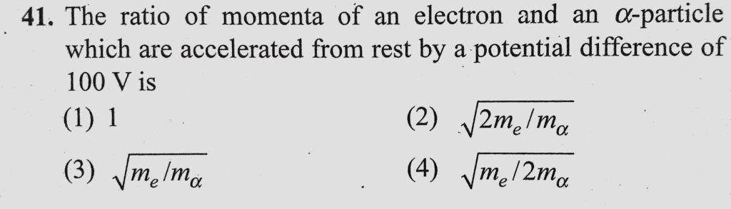 The ratio of momenta of an electron and an alpha particle which are accelerated from rest by a potential difference of 100 V is The ratio of momenta of an electron and an alpha particle which are accelerated from rest by a potential difference of 100 V is October 14, 2020 Category: Uncategorised (JEE Advanced Physics by BM Sharma + GMP Solutions) , Facebook Messenger WhatsApp Share this:TwitterFacebook Related