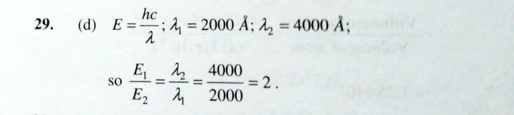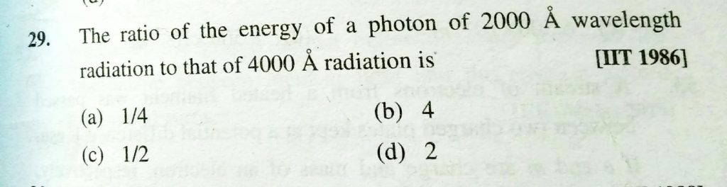 The ratio of the energy of a photon of 2000 A wavelength radiation to that of 4000 A radiation is (a) 1/4 (b) 4 (c) 1/2 (d) 2 The ratio of the energy of a photon of 2000 A wavelength radiation to that of 4000 A radiation is (a) 1/4 (b) 4 (c) 1/2 (d) 2 November 30, 2020 Category: Uncategorised (JEE Advanced Physics by BM Sharma + GMP Solutions) , Facebook Messenger WhatsApp Share this:TwitterFacebook Related