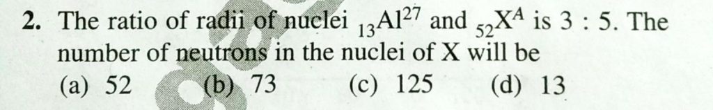 The ratio of the radii of the nuclei 13 Al 27 and 52 X A is 3 :5. the number of neutrons in the nuclei of X will be The ratio of the radii of the nuclei 13 Al 27 and 52 X A is 3 :5. the number of neutrons in the nuclei of X will be September 14, 2020 Category: Uncategorised (JEE Advanced Physics by BM Sharma + GMP Solutions) , Facebook Messenger WhatsApp Share this:TwitterFacebook Related