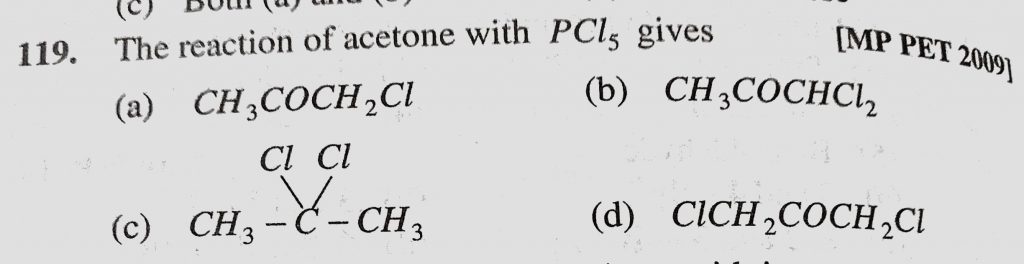 The reaction of acetone with PCl5 gives (a) CH3COCH2Cl (b) CH3COCHCl2 (c) (d) ClCH2COCH2Cl The reaction of acetone with PCl5 gives (a) CH3COCH2Cl (b) CH3COCHCl2 (c) (d) ClCH2COCH2Cl February 12, 2021 Category: Uncategorised (JEE Advanced Physics by BM Sharma + GMP Solutions) , Facebook Messenger WhatsApp Share this:TwitterFacebook Related