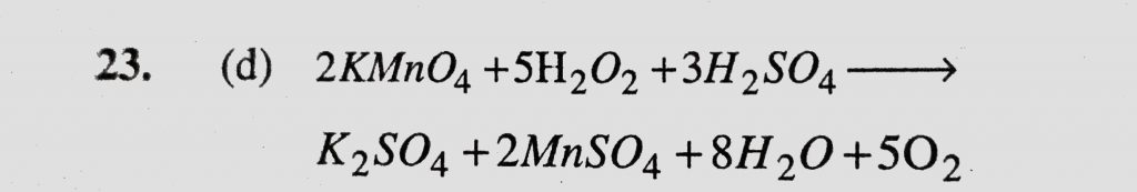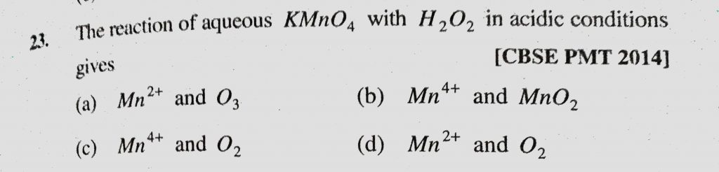 The reaction of aqueous KMnO4 with H2O2 in acidic conditions gives (a) Mn 2+ and O3 (b) Mn 4+ and MnO2 (c) Mn 4+ and O2 The reaction of aqueous KMnO4 with H2O2 in acidic conditions gives (a) Mn 2+ and O3 (b) Mn 4+ and MnO2 (c) Mn 4+ and O2 December 1, 2020 Category: Uncategorised (JEE Advanced Physics by BM Sharma + GMP Solutions) , Facebook Messenger WhatsApp Share this:TwitterFacebook Related