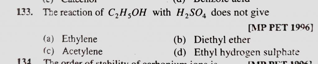 The reaction of C2H5OH with H2SO4 does not give (a) Ethylene (b) Diethyl ether (c) Acetylene (d) Ethyl hydrogen sulphate The reaction of C2H5OH with H2SO4 does not give (a) Ethylene (b) Diethyl ether (c) Acetylene (d) Ethyl hydrogen sulphate February 14, 2021 Category: Uncategorised (JEE Advanced Physics by BM Sharma + GMP Solutions) , Facebook Messenger WhatsApp Share this:TwitterFacebook Related
