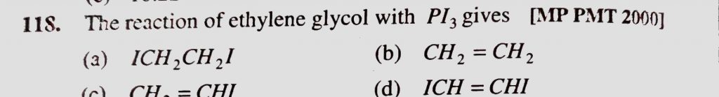 The reaction of ethylene glycol with PI3 gives (a) ICH2CH2I (b) CH2 = CH2 (c) CHI = CHI (d) ICH = CHI The reaction of ethylene glycol with PI3 gives (a) ICH2CH2I (b) CH2 = CH2 (c) CHI = CHI (d) ICH = CHI February 14, 2021 Category: Uncategorised (JEE Advanced Physics by BM Sharma + GMP Solutions) , Facebook Messenger WhatsApp Share this:TwitterFacebook Related