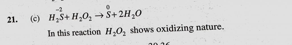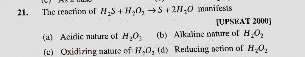 The reaction of H2S + H2O2 to S + 2H2O manifists (a) Acidic nature of H2O2 (b) Alkaline nature of H2O2 (c) Oxidizing nature of H2O2 The reaction of H2S + H2O2 to S + 2H2O manifists (a) Acidic nature of H2O2 (b) Alkaline nature of H2O2 (c) Oxidizing nature of H2O2 November 13, 2020 Category: Uncategorised (JEE Advanced Physics by BM Sharma + GMP Solutions) , Facebook Messenger WhatsApp Share this:TwitterFacebook Related
