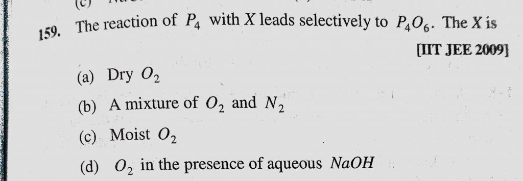 The reaction of P4 with X leads selectively to P4O6. The X is (a) Dry O2 (b) A mixture of O2 and N2 (c) Moist O2 The reaction of P4 with X leads selectively to P4O6. The X is (a) Dry O2 (b) A mixture of O2 and N2 (c) Moist O2 November 28, 2020 Category: Uncategorised (JEE Advanced Physics by BM Sharma + GMP Solutions) , Facebook Messenger WhatsApp Share this:TwitterFacebook Related