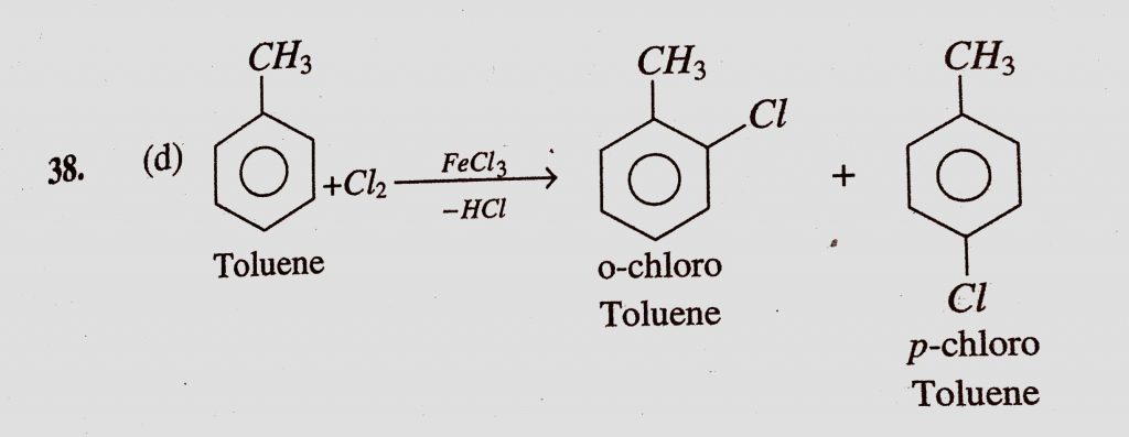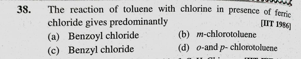 The reaction of toluene with chlorine in presence of ferric chloride gives predominantly (a) Benzoyl chloride (b) m-chlorotoluene (c) Benzyl chloride The reaction of toluene with chlorine in presence of ferric chloride gives predominantly (a) Benzoyl chloride (b) m-chlorotoluene (c) Benzyl chloride December 16, 2020 Category: Uncategorised (JEE Advanced Physics by BM Sharma + GMP Solutions) , Facebook Messenger WhatsApp Share this:TwitterFacebook Related