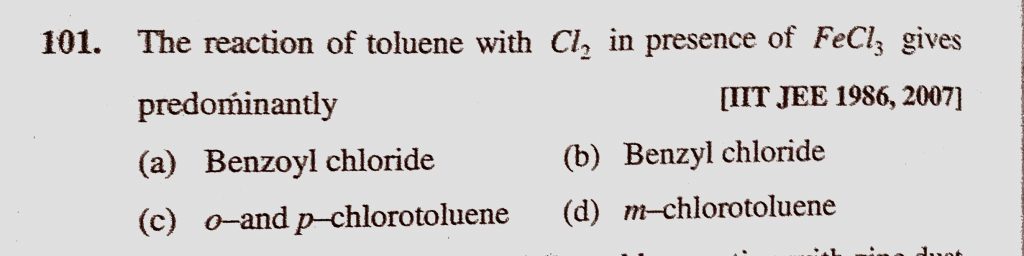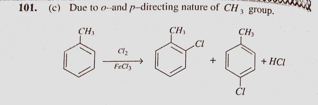 The reaction of toluene with Cl2 in presence of FeCl3 gives predominantly (a) Benzoyl chloride (b) Benzyl chloride (c) o-and p-chlorotoluene The reaction of toluene with Cl2 in presence of FeCl3 gives predominantly (a) Benzoyl chloride (b) Benzyl chloride (c) o-and p-chlorotoluene December 16, 2020 Category: Uncategorised (JEE Advanced Physics by BM Sharma + GMP Solutions) , Facebook Messenger WhatsApp Share this:TwitterFacebook Related