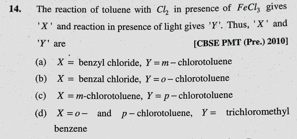 The reaction of toluene with Cl2 in presence of FeCl3 gives X and reaction in presence of light gives ‘Y’. Thus ‘X ‘ and ‘Y’ are The reaction of toluene with Cl2 in presence of FeCl3 gives X and reaction in presence of light gives 'Y'. Thus 'X ' and 'Y' are December 15, 2020 Category: Uncategorised (JEE Advanced Physics by BM Sharma + GMP Solutions) , Facebook Messenger WhatsApp Share this:TwitterFacebook Related