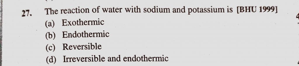 The reaction of water with sodium and potassium is (a) Exothermic (b) Endothermic (c) Reversible The reaction of water with sodium and potassium is (a) Exothermic (b) Endothermic (c) Reversible November 13, 2020 Category: Uncategorised (JEE Advanced Physics by BM Sharma + GMP Solutions) , Facebook Messenger WhatsApp Share this:TwitterFacebook Related