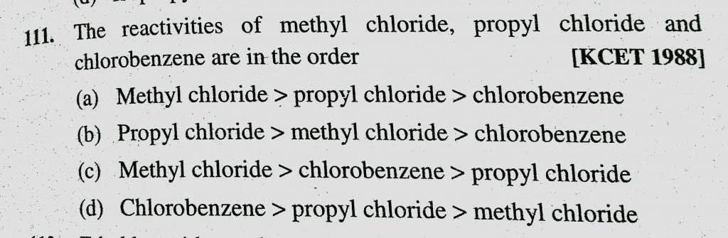The reactivities of methyl chloride, propyl chloride and chlorobenzene are in the order (a) Methyl chloride > Propyl chloride > Chlorobenzene propyl chloride and chlorobenzene are in the order (a) Methyl chloride > Propyl chloride > Chlorobenzene The reactivities of methyl chloride February 8, 2021 Category: Uncategorised (JEE Advanced Physics by BM Sharma + GMP Solutions) , Facebook Messenger WhatsApp Share this:TwitterFacebook Related