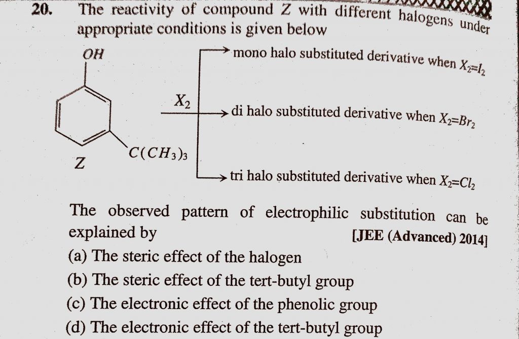 The reactivity of compound Z with different halogens under appropriate conditions is given below The observed pattern of electrophilic substitution can be explained by The reactivity of compound Z with different halogens under appropriate conditions is given below The observed pattern of electrophilic substitution can be explained by December 12, 2020 Category: Uncategorised (JEE Advanced Physics by BM Sharma + GMP Solutions) , Facebook Messenger WhatsApp Share this:TwitterFacebook Related