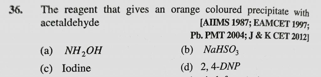 The reagent that gives an orange coloured precipitate with acetaldehyde (a) NH2OH (b) NaHSO3 (c) Iodine (d) 2, 4-DNP 4-DNP The reagent that gives an orange coloured precipitate with acetaldehyde (a) NH2OH (b) NaHSO3 (c) Iodine (d) 2 February 11, 2021 Category: Uncategorised (JEE Advanced Physics by BM Sharma + GMP Solutions) , Facebook Messenger WhatsApp Share this:TwitterFacebook Related
