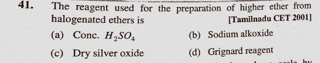The reagent used for the preparation of higher ether from halogenated ethers is (a) Conc. H2SO4 (b) Sodium alkoxide (c) Dry silver oxide (d) Grignard reagent The reagent used for the preparation of higher ether from halogenated ethers is (a) Conc. H2SO4 (b) Sodium alkoxide (c) Dry silver oxide (d) Grignard reagent February 10, 2021 Category: Uncategorised (JEE Advanced Physics by BM Sharma + GMP Solutions) , Facebook Messenger WhatsApp Share this:TwitterFacebook Related