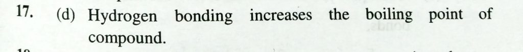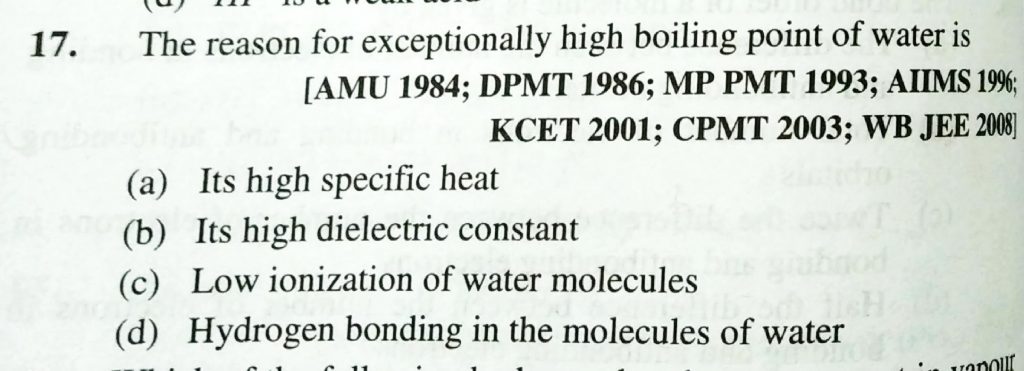 The reason for expceptionally high boiling point of water is (a) Its high specific heat (b) Its high dielectric constant (c) Low ionization of water molecules (d) Hydrogen bonding in the molecules of water Intramolecular hydrogen bond is present in (a) Water (b) o - nitrophenol (c) p - niitrophenol December 9, 2020 Category: Uncategorised (JEE Advanced Physics by BM Sharma + GMP Solutions) , Facebook Messenger WhatsApp Share this:TwitterFacebook Related