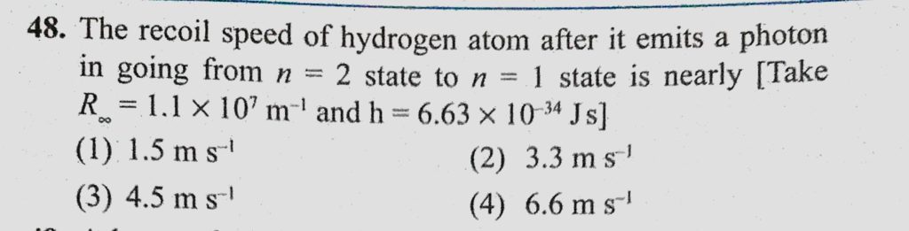 The recoil speed of hydrogen atom after it emits a photon in going from n = 2 state to n = 1 state is nearly (Take R infinity = 1.1 * 10^7 m^-1 and h = 6.63 * 10^-34 Js) The recoil speed of hydrogen atom after it emits a photon in going from n = 2 state to n = 1 state is nearly (Take R infinity = 1.1 * 10^7 m^-1 and h = 6.63 * 10^-34 Js) October 15, 2020 Category: Uncategorised (JEE Advanced Physics by BM Sharma + GMP Solutions) , Facebook Messenger WhatsApp Share this:TwitterFacebook Related