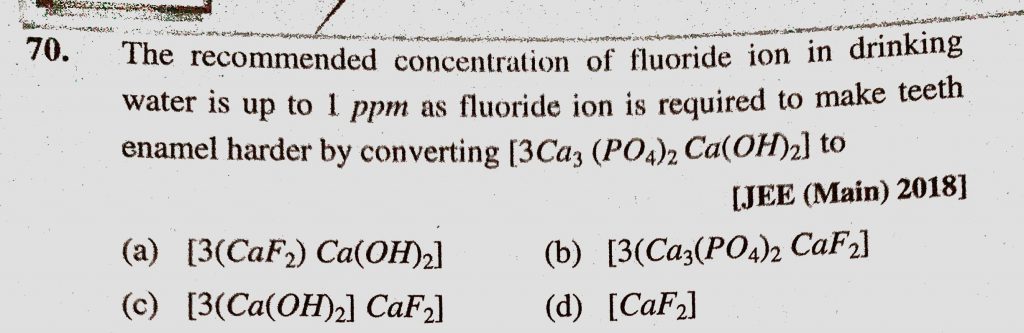 The recommended concentration of fluoride ion in drinking water is up to 1 ppm as fluoride ion is required to make teeth enamel harder by converting (3Ca3 (PO4)2 Ca(OH)2) to The recommended concentration of fluoride ion in drinking water is up to 1 ppm as fluoride ion is required to make teeth enamel harder by converting (3Ca3 (PO4)2 Ca(OH)2) to December 5, 2020 Category: Uncategorised (JEE Advanced Physics by BM Sharma + GMP Solutions) , Facebook Messenger WhatsApp Share this:TwitterFacebook Related